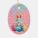 Cúpula de Pascua con orejas de conejo sobre huevos decorados sobre un fondo rosa de menta y polkadots blancos con goteo de hielo de caramelo pastel.