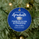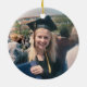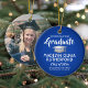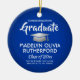 Conmemorar el logro de la graduación con una foto personalizado de adorno de Navidad azul y blanco redondo de la graduación. La imagen y todo el texto son simples para el personalizar. Incluya el nombre y el título de la escuela, felicitaciones, gracias mamá y papá, u otro mensaje de su elección. El diseño presenta un fondo azul real, un gorro de graduación de Relieve metalizado plateado falso gris, nombre de tipografía moderna personalizada, año escolar y de clase, y una foto de su elección, como una foto de la tercera edad o una imagen de la ceremonia de graduación. Ofrece una idea de regalo de gran interés y una elegante adición a la decoración de casa de Navidad. ¡Felicitaciones al graduado!
