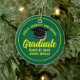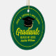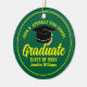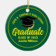 Este adorno navideño moderno verde y amarillo personalizado para graduado senior presenta el nombre de tu escuela secundaria o universidad para la promoción de 2026. Personalízalo con tu año de graduación debajo del elegante texto manuscrito y el gorro de graduación negro para un regalo de graduación personalizado genial.