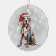 En la parte delantera de este adorno navideño hay una imagen de un perro Gran Danés que lleva un sombrero de Santa y está envuelto en luces de Navidad de colores. La imagen está colocada sobre un fondo festivo de bokeh plateado. La parte posterior del adorno tiene el mismo fondo con texto personalizado que actualmente dice "Feliz Navidad Feliz Año Nuevo", la fecha y su firma. Divertido para cualquiera, pero especialmente para los fanáticos de los Grandes Daneses.
