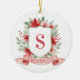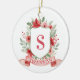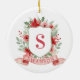 This Christmas ornament has a preppy grandmillennial design featuring a floral crest surrounded with berries with a monogram letter in the center.