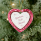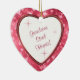 Este es un maravilloso adorno navideño para un abuelo, ya sea para recibir o para dar como regalo familiar. Tiene un centro de corazón blanco con forma de corazón enmarcado en rojo con un borde de corazones rojos y rosados. En el centro está tu texto personalizado en rojo. Actualmente, el texto dice "¡Nietos roban corazones!". El texto es completamente personalizable, así que puedes personalizarlo o hacer que diga lo que quieras. Estrellas rojas decoran el interior blanco. Hay un segundo campo de texto en la parte posterior, que tiene el mismo borde de corazones y la misma imagen interior. Este es un regalo especial para la familia que será valorado para siempre.