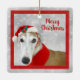 Navidades de Greyhound -un hombre de la cabeza rojo y un galgo blanco vestido con un sombrero de Santa y un collar rojo ambientado en un fondo de nieve gris plateado. Enmarcado con un marco cuadrado rojo. Feliz Navidad con el tipo de letra rojo se puede personalizar con tu mensaje.