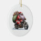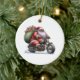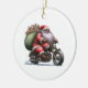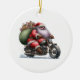 Guay Santa en una motocicleta con su bolsa de regalos en un adorno navideño de cerámica. El texto de la parte posterior puede cambiarse. Ilustracion acuarela con gráfico asistido por IA adquirido con uso comercial. Pintura: RedHeronLighthouse