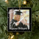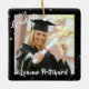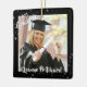 Crea un adorno conmemorativo de la graduación de vacaciones de keepsake personalizado con dos fotos del graduado (una en la parte delantera y otra en la parte trasera), su nombre y año de clase con el título de tipografía de escritura de pincel moderno GRADUATE contra un fondo negro editable con estrellas. Póngase en contacto con el diseñador a través de Zazzle Chat o makeitaboutyoustore@gmail.com si desea modificar este diseño o en otro producto.