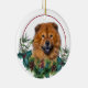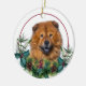 En la parte delantera de este adorno navideño hay una imagen de un perro de Chow Chow rojo que asoma a una masa sagrada y verde. Las bayas rojas y los conos de pino decoran los estribillos de pino y de caramelo. La imagen se coloca en un círculo blanco dentro de un círculo de líneas rojas delgadas. La parte posterior del ornamento tiene la misma corona de masa eververde y círculo con el texto personalizado en rojo.