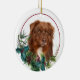 En la parte delantera de este adorno navideño hay un retrato de un hermoso perro pastor australiano rojo que asoma a una masa sagrada y verde. Las bayas rojas y los conos de pino decoran los estribillos de pino y de caramelo. La imagen se coloca en un círculo blanco dentro de un círculo de líneas rojas delgadas. La parte posterior del ornamento tiene la misma corona de masa eververde y círculo con el texto personalizado en rojo.