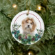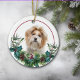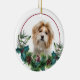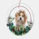 En la parte delantera de este adorno navideño hay un hermoso retrato de un perro shih tzu rojo y blanco que asoma a una masa sagrada y verde. Las bayas rojas y los conos de pino decoran los estribillos de pino y de caramelo. La imagen se coloca en un círculo blanco dentro de un círculo de líneas rojas delgadas. La parte posterior del ornamento tiene la misma corona de masa eververde y círculo con el texto personalizado en rojo.