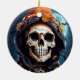 Ornamento con un ilustracion de un esqueleto usando una chaqueta encapuchada con el gorra de una bruja naranja encima. Luna brillante en la parte de atrás con un solo bate volando cerca. Divertido diseño de Halloween del otoño.