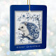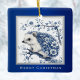 Este superlindo erizo júnior está decorado con telas de color azul floral Chinoiserie, como los azulejos azules delft y portugueses. Este erizo, flores y árboles están impresos en un azul real suave, y rodeados de un marco azul y plateado. Las palabras "Feliz Navidad" aparecen debajo en plata, y se puede editar este texto si se desea, siempre y cuando se ajuste a una línea.