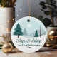 Un hermoso paisaje invernal con pinos verdes verde azulados y terreno cubierto de nieve en adornos personalizados de vacaciones de negocios. Personalizar este regalo de honor de Felices Fiestas para sus clientes corporativos o empleados.