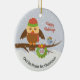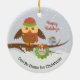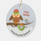 Admire el espíritu festivo con este adorno de personalizable que presenta una hermosa lechuza nevada y un pajarito vestido con gorras y bufandas acogedoras. Este diseño está acentuado con una corona de Navidades festivos y nieve recién caída para añadir un toque de tierra de maravillas de invierno a tu árbol. Modifique las tres áreas de texto que dicen, "Felices Fiestas", "Búho sea hogar para Navidades", y el año en curso para crear un regalo único para la familia y amigos.