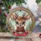Holiday Reindeer Festive rustic Christmas ornament features a round, brown wooden frame and giving it a cozy Xmas look. Inside, a cute baby woodland wildlife animal, deer with antlers, in a cartoon graphic style, wearing a brown sweater, in the foreground. Enjoy the winter season charm of this delightful unique fawn decoration. Same Image is on the front and back. This ensures that no matter how the whimsical doe decor turns, it always looks complete. 🦌🎄