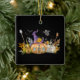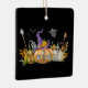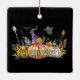Ornamento con una linda imagen de una casa de calabaza embrujada con un gran gorra de brujas encima y fantasmas y murciélagos volando por ahí.