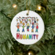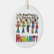 El diseño de la humanidad incluye una colección de personas diferentes y la palabra "Humanidad" que hay debajo. Un gráfico unificador muestra a la gente uniéndose en lugar de dividirse. Todos somos miembros de la raza humana, empecemos desde ahí y tratemos a todos con respeto y amabilidad, celebremos nuestras diferencias y nuestra humanidad.