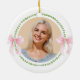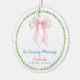 Honor the memory of a loved one with this personalized photo memorial ornament, beautifully designed to offer comfort during the holidays and beyond. Featuring a soft pink bow and delicate green leaf border on both sides, this round ceramic ornament combines elegance and sentimentality. One side displays a custom photo framed by pink bows and greenery, while the other includes “In Loving Memory,” the name, and dates for a heartfelt tribute. The pastel design and gentle color palette make this ornament especially fitting for remembering a beloved daughter, sister, mother, or friend. Perfect as a remembrance keepsake, sympathy gift, or holiday tribute, this custom memorial ornament can be displayed on a Christmas tree, ornament stand, or year-round in a special place. Whether given to grieving family members or kept as a personal token, it offers a meaningful way to celebrate life and keep their memory close.