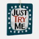 Un divertido diseño tipográfico que dice "Just Try Me" (Pruébeme). Es texto en negro y rojo sobre un rectángulo blanco con puntos blancos divertidos y juguetones rodeándolo, todo sobre un fondo verde azulado.