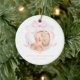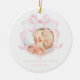 Este ornamento de anuncio de nacimiento presenta un diseño suave y elegante. Muestra una foto de un recién nacido enmarcado por una delicada cinta rosa acuarela en forma de arco. Con una combinación de colores rosa y blanco, es una elección perfecta para anunciar la llegada de su bebé.