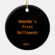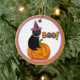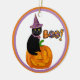 Decoren su árbol Holloween con este adorable adorno personalizado. El diseño incluye una linterna Jack O con un gato negro sentado sobre ella y una palabra de diseño gráfico Boo! En la parte posterior es donde personalizará con su propio texto.