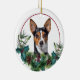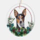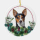 En la parte delantera de este adorno navideño hay una imagen de un Jack Russell Terrier de tres colores que asoma a una masa holgada y verde. Las bayas rojas y los conos de pino decoran los estribillos de pino y de caramelo. La imagen se coloca en un círculo blanco dentro de un círculo de líneas rojas delgadas. La parte posterior del ornamento tiene la misma corona de masa eververde y círculo con el texto personalizado en rojo.