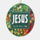 Elegante JESUS Navidad adorno de cerámica con diseño abstracto festivo no tradicional con un mensaje Navidad tradicional, que incluye tonos rojos y verdes, estrellas de oro falsas y tipografía en negrita blanca. Ideal para los fiambres, regalos de iglesia, bolsos de favores, etc. Parte de la colección de NAVIDADES STARS de diseños bereanos. Hay regalos coincidentes disponibles. Podrá elegir entre una amplia selección de prendas de vestir, tarjetas, decoración casera y regalos de Navidades cristianos, diseñados por diseños bereanos.