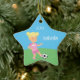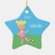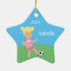 ¡Personaliza este adorable adorno de fútbol para el chica amante del fútbol en tu vida! Este adorno incluye a un chica rubio que patea una pelota de fútbol en un campo verde con un cielo azul. También disponible en otros colores para una personalización adicional.