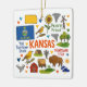 Commemorate your trip to the state of Kansas with this modern keepsake Christmas ornament, featuring hand-drawn style illustrations of iconic food, animals, landmarks, landscapes, and culture. Personalize the back to mark your US adventure and create a memory you'll hang up on the tree for the Holidays year after year.