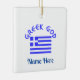 El diseño personalizado muestra la bandera de Grecia y las palabras DIOS GRIEGO arriba, en letras azules. Agregue un nombre debajo para personalizar este ornamento o crear un regalo personalizado. Diversión para griego-americanos, canadienses griegos o cualquier persona con herencia, ascendencia o cultura griegas. ¡YIASSOU! La bandera es azul y blanca con una cruz azul sobre un fondo blanco en la parte superior izquierda.