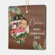 Celebre el hito especial de su pequeña con este encantador adorno de fotos rústicas de madera. Este diseño le da un toque cálido y acogedor a las vacaciones, con su rico fondo de madera y sus hermosas ramas de pino acuático adornadas con luces festivas. La plantilla hace que sea sencillo agregar tu foto, nombre y año favoritos para crear un keepsake único para la primera Navidad de tu bebé. Este adorno de acuarela personalizado es una manera perfecta de decorar tu árbol y hace un regalo conmovedor para que nuevos padres o abuelos aprecien durante muchas temporadas de vacaciones.