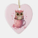Un adorno con una adorable imagen de un búho sentado en una taza de café. Los corazones se cercan y un solo rosa se coloca en la parte inferior de la taza.