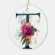 Hermoso ornamento cerámico presenta lujosos florales que incluyen hojas de oro, rosa púrpura y adornos de flores silvestres azules en letra grande / T inicial. Personalice con nombre o mensaje en la parte posterior