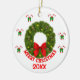 Puedes sustituir el fondo blanco detrás de este diseño por cualquier color que prefieras. La corona de Navidades es acentuada con un brillante arco rojo, latas de dulces y bolas de colores dorados. El ornamento está bordeado de pares de cañas de caramelo cruzadas y de arcos verdes. La parte posterior puede ser más personalizada y el texto puede cambiarse en tamaño, color y fuente. La parte posterior o el adorno está bordeada por pares más pequeños de bastones cruzados con arcos verdes.
