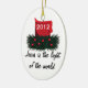 Ambos lados de este ornamento tienen una vela encendida rojo con una guirnalda en su base. Un lado tiene las palabras: Jesús es la luz del mundo debajo de la vela. El año es adaptable y se imprime en blanco en la vela. él el otro lado tiene 8:12 de Juan impreso de la versión de rey James - entonces spake Jesús otra vez a ellos, decir, soy la luz del mundo: él ese followeth yo no caminará en oscuridad, sino tendrá la luz de la vida. Las palabras: Las Felices Navidad se imprimen en verde sobre el verso de la escritura y debajo son una vela encendida un rojo más pequeño.