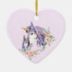 Ornamento con un elegante ilustracion acuático con una mamá acuarela y un bebé unicornio con mané morado y forelock. Delicadas flores naranjas rodean al par.
