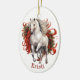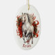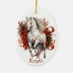 En la parte delantera de este adorno cerámico conservador se encuentra un hermoso y elegante caballo blanco. El caballo está rodeado de vegetación y de una cinta roja brillante. El nombre de su hijo está en la parte inferior. La parte trasera del adorno tiene un mensaje de Feliz Navidad y tu firma. Perfecto para cualquier niño que ame los caballos.
