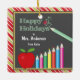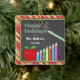 Este adorno de árbol de Navidad incluye una pizarra, una manzana roja y lápices de colores. El texto en el pizarrón dice: Felices Fiestas. El texto del personalizable le permite añadir el nombre del profesor y su propio nombre. Esto hace que unos Navidades increíbles mantengan un regalo para un profesor especial.