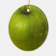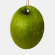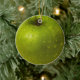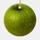 Vista más cercana de una única manzana verde. La manzana está húmeda y muy cubierta de gotas de agua limpia. Complicado de cerámica divertida