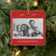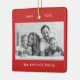 Estos sencillos y minimalistas adornos de vacaciones de Navidades incluyen tu foto personal favorita en el frente junto con tu nombre y el año en blanco de máquina de escribir, el texto en un fondo rojo festivo. La parte posterior muestra otra de sus fotos, iluminada con una superposición para que pueda agregar texto adicional o nombres justo encima.