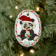 Aquí hay un adorable adorno navideño para cualquier nieto que ame los osos panda. Un panda blanco y negro de ojos amplios sostiene un bastón de caramelo y lleva un sombrero de Santa. Debajo de la imagen está el nombre especial de su hijo en verde. La imagen está enmarcada con un patrón de rayas de caña de caramelo rojo, verde y blanco. La parte posterior del ornamento tiene el mismo marco rayado y más campos de texto para que se personalizar.