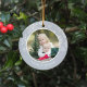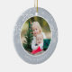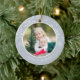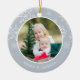 Festividad de la foto El adorno de Navidad muestra una foto favorita en cada lado, enmarcada por copos de nieve blancos sobre gris claro y neutro. Personalice con una leyenda personalizado en cada lado; mostrada con nombres y el año.