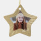 La parte frontal de este adorno en forma de estrella sostiene la foto de su graduado en un marco que coincide con la forma del adorno. El año de graduación está en dorado pálido en la parte inferior derecha de la foto, y todo está enmarcado en un fondo con un patrón dorado brillante. La parte posterior del adorno tiene el mismo patrón dorado, con la estrella blanca central que sostiene su texto personalizado en dorado más oscuro. ¡Un hermoso recuerdo para cualquier graduado!