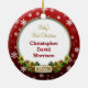 Adorable cerámica redonda Baby's First Christmas personalizado Photo frame adornando el fondo rojo con copos de nieve y un spray de pino con conos de pino. La parte delantera tiene un lugar para tu propia foto subida y el año, mientras que la parte trasera está lista para que puedas personalizar con el nombre y el año del bebé también. Hace el regalo perfecto para los abuelos de los nuevos padres y será un placer atesorado año tras año.