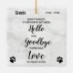 Honra a tu mejor amigo con un adorno conmemorativo personalizado. Este único adorno de honor conmemorativo es el regalo perfecto para usted, familia o amigos para rendir homenaje a su ser querido. Esperamos que su monumento les traiga paz, alegría y recuerdos felices. Cita "No te olvides, en algún lugar entre Hola y Adiós, había amor, tanto amor. ." Personaliza con nombre y fechas. El ornamento es de doble cara, ambos lados son idénticos. DERECHOS RESERVADOS © 2020 Judy Burrows, Black Dog Art - Todos los derechos reservados