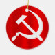 Martillo y hoz sobre un círculo rojo brillante aislado en un fondo blanco.