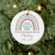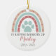 Presentamos nuestro ornamento cerámico de Mascota DIY, la manera perfecta de conmemorar a un mascota querido y apreciar su memoria para siempre. Este adorno conmemorativo mascota personalizado le permite capturar la esencia de su bebé incorporando una preciada fotografía de su mascota. Simplemente elige tu imagen favorita. Con la opción de añadir el nombre de su mascota, este ornamento se convierte en un sincero homenaje único a su mascota. Mostrar en tu árbol de vacaciones o como un keepsake todo el año. El diseño presenta una huella azul rodeada por un arco iris boho con corazones y huellas de aletas y las palabras: En memoria amorosa, nombre de tu mascota y años, o deja en blanco si lo prefieres.
