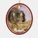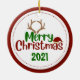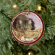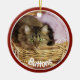 Foto mascota ornamento navideño hecho en forma de cerámica redonda, con foto personalizado con marcos rojos gráficos, en el frente con texto blanco. La parte trasera está hecha en rojo, verde y blanco con texto gráfico que lee Feliz Navidad y un año personalizado que personalizas. Añada la foto de su mascota, su nombre y el año de un gran adorno de vacaciones para recordar a su mascota.