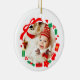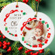 Celebra la primera Navidad de tu pequeña con este encantador adorno fotográfico, con una deliciosa imagen de tu bebé enclavado en una vibrante corona roja y verde. Adornado con encantadores regalos, un flechazo de lazo festivo, y acentos holly, este keepsake captura la magia de la temporada y crea un recuerdo duradero. Perfecto para colgar en el árbol o exhibirse en un mantel, este adorno es una adición encantadora a su decoración de vacaciones y un tesoro para los años venideros.