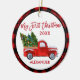 Guión de pincel moderno Mi primer bebé navideño primer ornamento navideño incluye Watercolor Vintage Rojo Camión con árboles de Navidad, luces, nieve y regalos de Navidad. Guión rojo. Borde de rojizo de plástico.