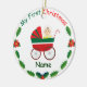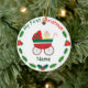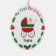 Un bebé en el coche de bebé de rojo y verde, y decoraciones con "Mi primera Navidad". Un Navidad lindo y único para que los bebés recuerden la primera Navidad de su bebé.