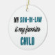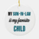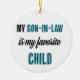¡Divertido diseño de adorno navideño para sus suegros! Hace un gran regalo de broma por el Día de la Madre o regalo de mordaza por el Día del Padre. Incluye la frase "Mi yerno es mi hijo favorito". Provocaré algunas risas de sus suegros.